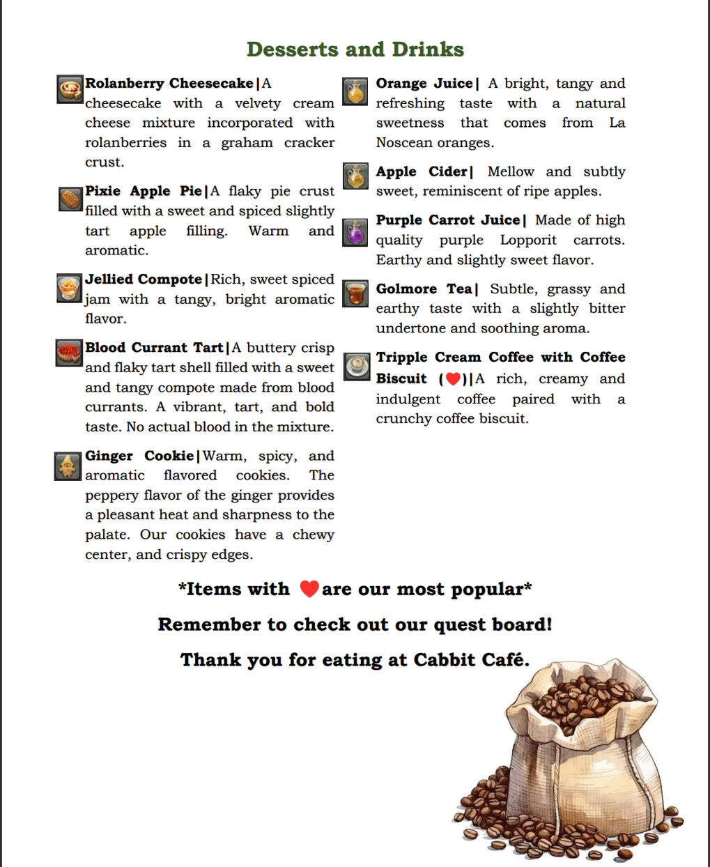 Quest Title: Eos's HarvestQuest Giver: Rei Toshi Guardian Fairy, EosQuest Objective: Assist Eos in gathering Pixie Apples for a special dessert at the Cabbit Cafe Bakery.Quest Description: Eos, a devoted guardian fairy working with Rei Toshi within the Cabbit Cafe, has taken on a crucial task. The renowned bakery nestled in these tranquil surroundings seeks to craft an exquisite dessert using the rare Pixie Apples. However, the orchards where these magical fruits grow are in need of replenishment. Eos, bound by duty, seeks the aid of a valiant adventurer to assist in gathering the essential ingredients.Quest Dialogue: