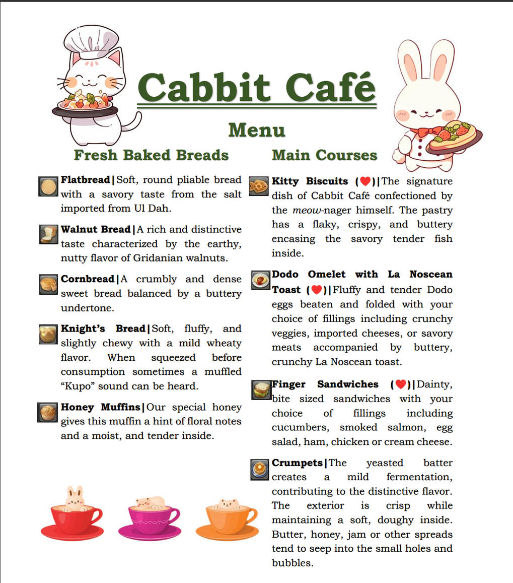 Welcome to Cabbit Cafe - Your Cozy Retreat in EorzeaIn the bustling realm of Eorzea, amid epic adventures and grand quests, there exists a charming sanctuary known as Cabbit Cafe. Nestled within the vibrant cities and sprawling landscapes, our Free Company is more than just a guild – it's a home away from home.What We Offer:A Simple Bakery Venue: Step into the heart of Cabbit Cafe, where the aroma of freshly baked bread and pastries fills the air. From artisanal loaves to delectable confections, our bakery serves up more than just treats; it serves up a sense of belonging.Warm Hospitality: At Cabbit Cafe, you are not just a member; you are family. Our mission is to create a friendly and safe environment where players of all levels, classes, and backgrounds can find solace and camaraderie.SFW RP Community: We take pride in being a Safe for Work (SFW) venue, ensuring that everyone, from the newest adventurers to seasoned veterans, feels comfortable and included.Our Philosophy:Eorzea can be a vast and daunting place, but within the walls of Cabbit Cafe, you'll find warmth, acceptance, and a community of like-minded individuals who share a passion for both the culinary arts and the adventure of a lifetime.What Sets Us Apart:Friendship and Fellowship: Beyond the battles and quests, we prioritize the bonds forged through laughter, shared stories, and the simple joy of a good meal.Events and Activities: From in-game celebrations to real-world gatherings, we offer a variety of events and activities that cater to diverse interests and ensure everyone has a role to play.A Home for Everyone: Whether you're a seasoned warrior or a novice crafter, whether you enjoy the thrill of dungeons or the tranquility of crafting, you'll find your place within our friendly community.Join Us Today:Eorzea may be a realm of magic and mystery, but Cabbit Cafe is a realm of friendship and hospitality. As you embark on your adventures, remember that there's a warm and welcoming haven waiting for you here.So why wait? Step through the doors of Cabbit Cafe, where the bread is always fresh, the company is always warm, and the sense of belonging is forever. Welcome home to Cabbit Cafe, where every member is family.